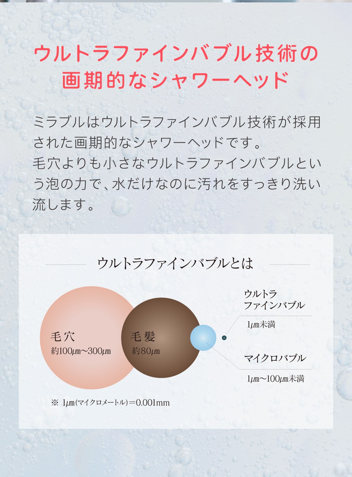 たまたま、ホテルで、ミラブルを使用。 何処にでもあるシャンプーリンスに、ドライヤーなのに、髪がサラサラなのにびっくり。 翌日、ホテルに問い合わせして、今回の最新のミラブルを購入。 やっぱり、髪がサラサラ、跳ねない、パサパサ感が減り、肌もツルツル、少し肌も明るく白くなりました。 値段が高く感じて、最初は悩みましたが、買って大正解、もっと早く購入したら良かったと思うくらいです。 毎日のお風呂が楽しみです。