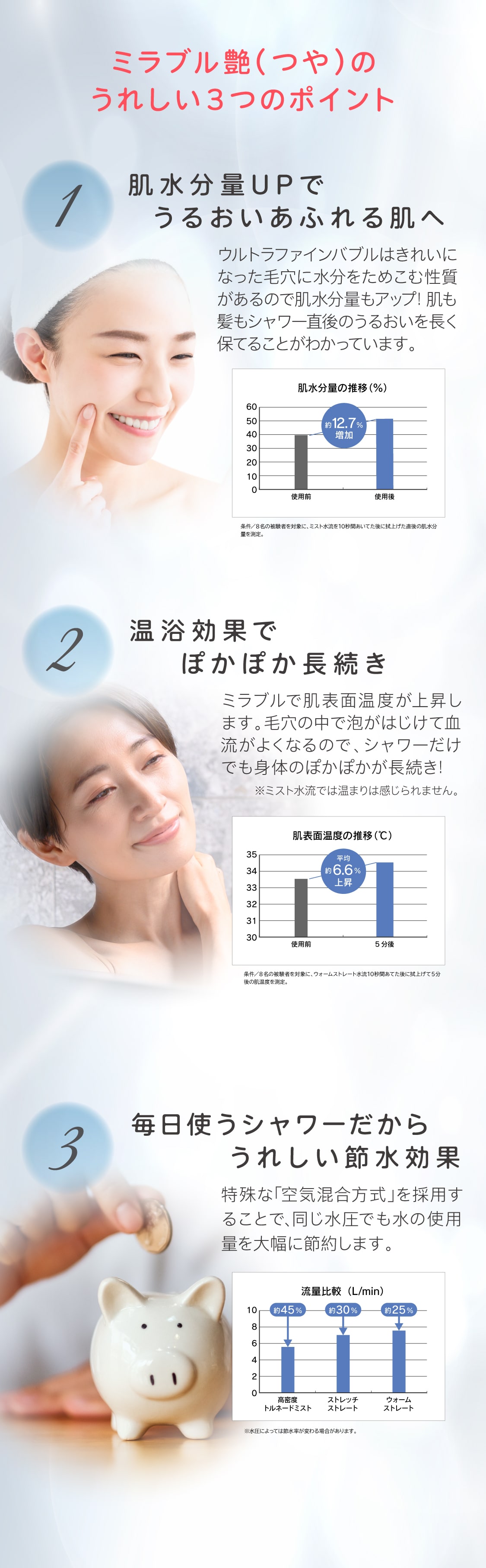 ミストが気に入って私も購入しました。 商品は数日でスムーズに届き、梱包もとても丁寧でした。 ミラブル艶はヘッドが小さいのでシャワーに時間がかかる、 というレビューを拝見した為少し不安でしたが 私の場合は同じ時間で質の高いシャワータイムを楽しめています。 ミストはミラブルゼロよりも肌あたりが強く感じますが、 ウォームストレートが気持ち良過ぎます。 寒い季節には温かい温度でウォームストレートを使用したら 絶対に気持ちいいだろうなと今から楽しみです。