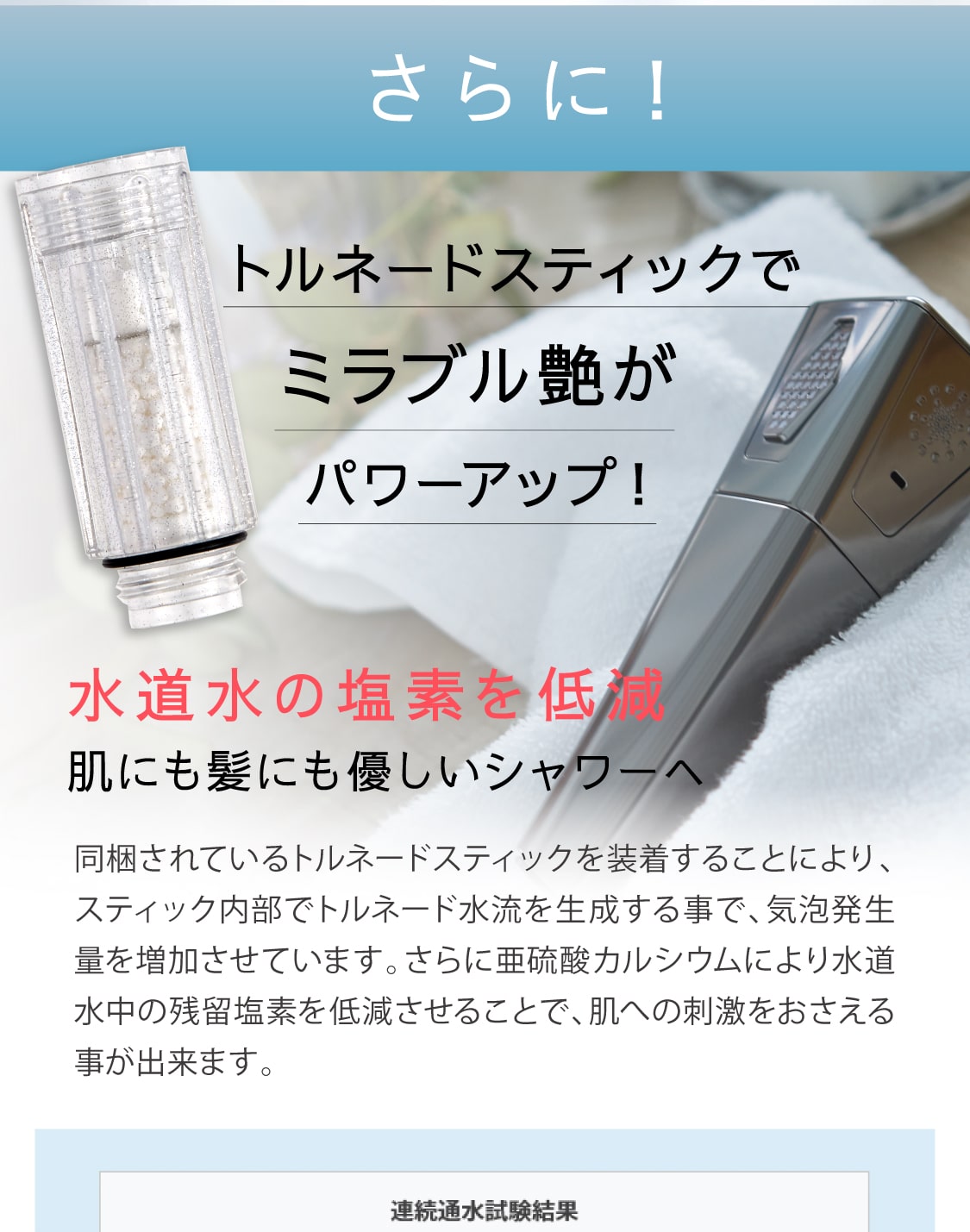 今まで使っていたシャワーヘッドが壊れたので、色々なものをみてミラブル艶に決めました。 説明書通りのきめ細かなミストで毛穴の奥まできれいになるような感覚。 使い始めてから顔も身体も水分を含んだもちもち肌になったような気がします。 髪もツヤツヤになりいいことばかりです。 もっと早く買えばよかったと思います。